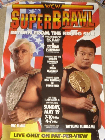 To try and make things right with the NWA board and New Japan, a rematch between Ric Flair and Tatsumi Fujinami was made in the United States. This event was titled ‘Superbrawl’ and took place at the Bayfront Arena in St. Petersburg, Florida. The official for this match would be Tiger Hattori. The main issues for this event was that there was no proper build up for WCW fans. Fujinami came in practically unannounced with no build up. WCW fans who were not familiar with the events at the Tokyo Dome were left with “just this Japanese wrestler” challenging Flair for the WCW belt.