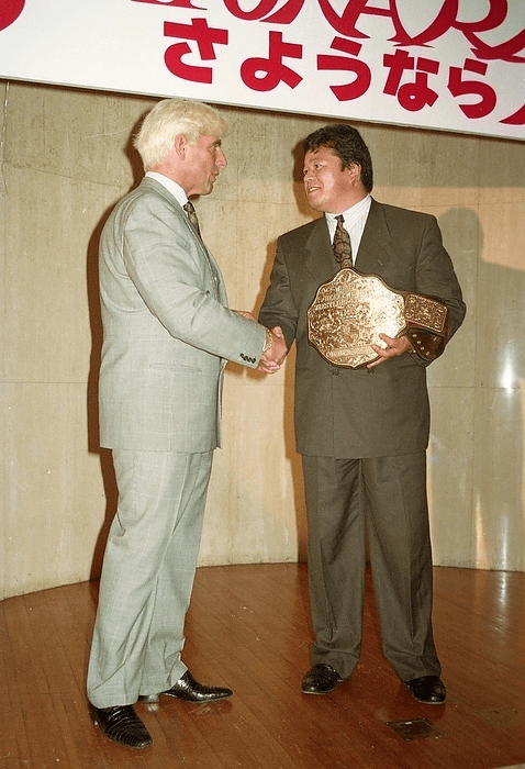 Tatsumi Fujinami would make history as the first man to simultaneously hold both the NWA world and IWGP championships. Or so New Japan and their fans thought. During a press conference with the champion Fujinami after the match, Flair barged in, grabbed the big gold belt and stormed out with it. That was WCW’s way of keeping the belt with Ric Flair as he returned to the states.