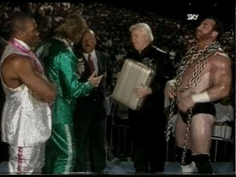 Hercules wound remain managed by Bobby Heenan until the Fall of 1988. It was then that The Brain announced that he was selling the contract of Hercules to ‘The Million Dollar Man’ Ted Dibiase. Dibiase bought the contract of Hercules to make him his own “personal slave.” A visibly shocked and upset Hercules (probably fed up from all his human trafficking in the mid 1980’s) refused to be sold to Dibiase. Instead, Hercules grabbed Heenan by his shirt collar and brought his now former manager to his knees.