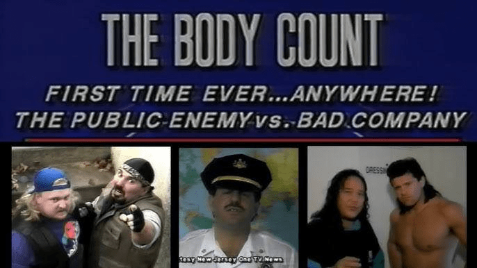 The participants were The Public Enemy (Rocco Rock and Johnny Grunge) against Badd Company (Pat Tanaka and Paul Diamond) The match was something called a “Body Count” match. The concept of the Body Count match was one member from each team wrestles, in this case it was Rocco Rock and Pat Tanaka, while the remaining members of each tag team – Johnny Grunge and Paul Diamond – were locked in cages. The cages were rigged with explosives and the loser of the match had their respective cage blown up.