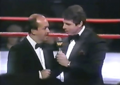 The WWF Event Center basically was a brief news like format that ran down all the house shows and pay per views coming to different areas around the country. It was done 4 days a week, 8 hours a day with over 90 cities getting individual mentions. If a wrestler was injured and was to be replaced on a show, Okerlund had to return to re-do event center segments. It became too intense for Okerlund to handle and demanded he no longer do them or he would walk. Craig DeGeorge replaced him and eventually, Sean Mooney was hired as his replacement and after some mentoring from Gene…Sean Mooney took over the job. In June of 1988, McMahon fired Okerlund after finishing his training of Sean Mooney. Okerlund’s voiceover work at the beginning of a WWF broadcast where he said, “The World Wrestling Federation…What the World is Watching” was immediately replaced by the voice of Howard Finkel.