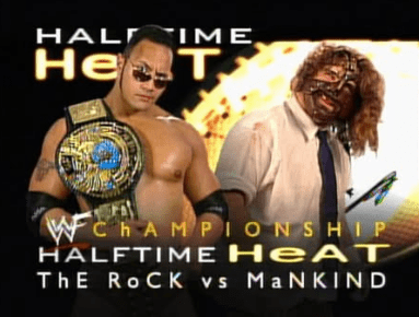 It was aptly named…’Halftime Heat’…and as previously mentioned, was a match that took place in an empty America West Arena in Phoenix, Arizona. An event of this magnitude had to be big for fans to switch over to the USA network…so….the match was a WWF title match that pitted the champion The Rock aka Dwayne Johnson versus the #1 contender Mankind aka Mick Foley.