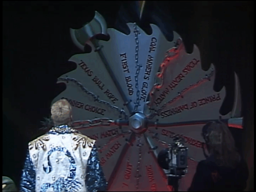 Spin the Wheel, Make the Deal in my view was a great idea. Basically, it was a wheel with 12 different gimmick matches on it. It included matches like First Blood, Coal Miner’s Glove, Prince of Darkness, Dog Collar, Barbed Wire and I Quit. The concept was first introduced for Halloween Havoc 1992 between Sting and Jake Roberts and done again the following year for Cactus Jack and Vader.