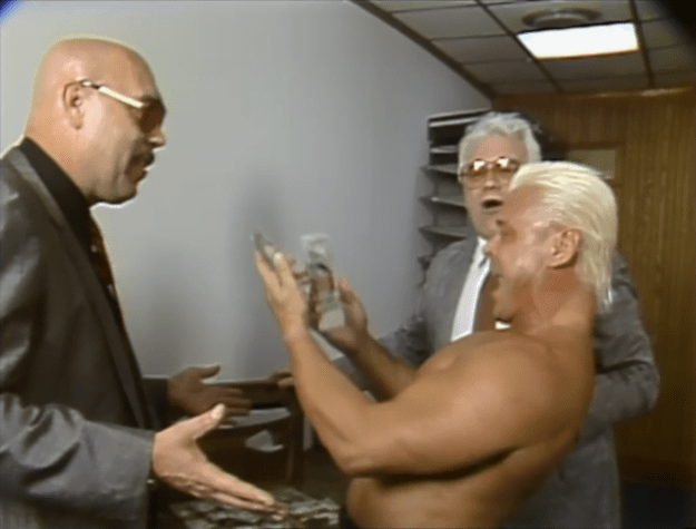 The announcers Jim Ross, Tony Schiavone and Bob Caudle played up the “shocking” heel turn by Garvin. A little while later, cameras caught Ronnie Garvin backstage with managers JJ Dillon and Gary Hart handing Garvin a briefcase. In that briefcase, was a bundle of cash which Garvin began kissing and rubbing all over his body. It became apparent, that Garvin sold his soul and friendship with Dusty Rhodes for money.