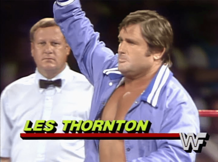 Les Thornton was an English pro wrestler who began his career in 1957 and wrestled all over Europe, Canada, Japan and here in the States for various NWA territories. He was a multiple time NWA World Junior heavyweight champion. He also competed against the likes of Dory Funk Jr, Harley Race, Billy Robinson and others. Thornton was considered by many of his peers not only a great technical wrestler, but a very tough individual as well. He joined the WWF around 1984 and was used primarily as enhancement talent. His most noteworthy WWF appearance came as a tag team partner of a young Jack Foley aka Mick Foley against the British Bulldogs in a squash match.