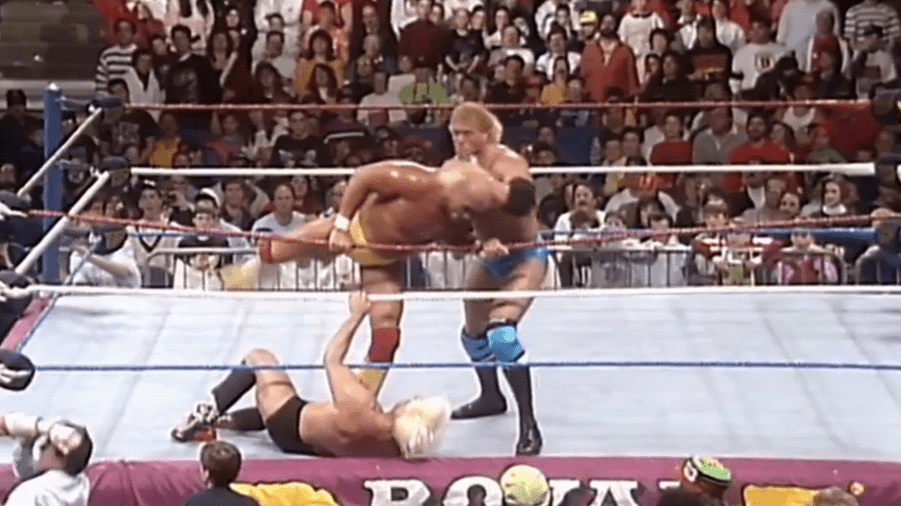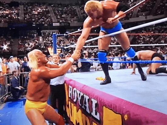 Vince was certainly reluctant considering he had a specific vision of what Sid Justice was going to be. Some have speculated that Sid wanted to become heel more so because being the face of the WWF meant more traveling, more special appearances and overall a much more grueling schedule. Sid didn’t necessarily want to give up the money, titles and everything a big push had to offer but he also didn’t want to give up one of his passions away from the ring, softball. Yes, Sid was an avid fan of playing softball and being the top guy just wouldn’t fit into that. Sid Justice would return from his injury at the 1992 Royal Rumble. The final four participants of the match were Hulk Hogan, Ric Flair, Randy Savage and Justice. In a bizarre turn of events at the time, Sid eliminated Hogan to the roar of the crowd in Albany, New York. Hulk was on the outside shocked that his “friend” would eliminate him from an everyman for themselves Rumble. Hulk started pleading with the fans at ringside but was greeted by boos from WWF fans who were clearly behind the Hulkster’s elimination.