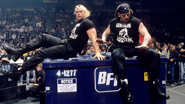 The New Age Outlaws were now a certifiable team and McMahon took notice. He gave the okay for the Outlaws to win the WWF tag team titles by defeating The Legion of Doom. Despite getting the titles which was a big deal, Gunn says his fondest wrestling memory was when Vince Russo wrote the angle that had the New Age Outlaws push a dumpster off the stage that had both Cactus Jack and ‘Chainsaw Charlie’ aka Terry Funk in it. There was a no holds barred match between Jack and Charlie when the two ended up in a dumpster at the top of the stage. The New Age Outlaws then came out…shut the top of the dumpster and pushed it off the stage. Gunn and Road Dogg agree that that was the angle that really solidified the team as truly legitimate by the fans.