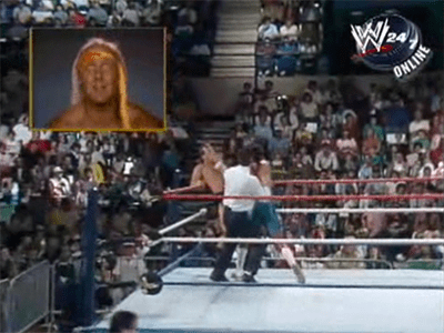 During a squash match against perennial jobber Terry Gibbs, Gorilla Monsoon excitedly introduced Honky Tonk to the more or less indignant fans. That is when McMahon told the television audience that the one and only Hulk Hogan had a special message about HTM. A second screen popped up during Honky’s match and low and behold it was the Hulkster cutting a promo endorsing Honky Tonk. In the promo Hogan said: