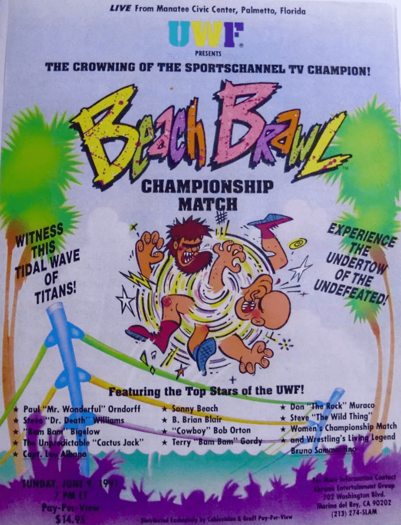 The UWF’s one and only pay per view named “Beach Brawl” has the distinction of having the lowest buy rate in wrestling history at 0.1 (roughly 17,970 buys) In comparison, the lowest WWE pay per view buy rate was December to Dismember which generated 90,000 buys. Additionally, Beach Brawl was held at a 4,000 seat arena and had an attendance of a little over 500 fans. Bad…bad…bad!