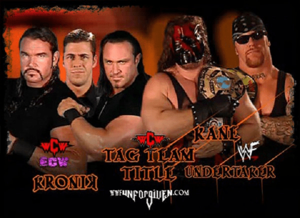 Kronik was immediately thrust into a major angle against the Undetaker and his “brother” Kane. As the storyline went, Stevie Richards blamed the Brothers of Destruction for dismantling the RTC (Right to Censor) faction. In a measure of revenge, Richards brought in Kronik who attacked the Undertaker by putting him through a table. That incident, would set up a match against the Brothers of Destruction at the WWF pay per view: Unforgiven.