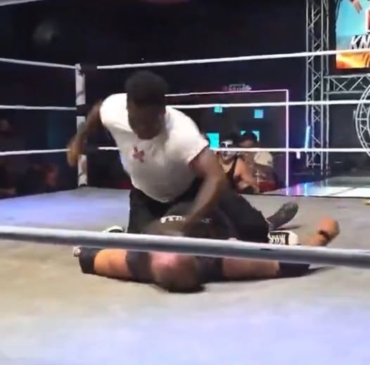 It apparently all started when Syko Stu smashed a beer can on the head of Raja Jackson. The video of that seemed that Stu was either playing around or was drunk and decided to mess with Raja. Either way, Raja was encouraged to get a receipt or payback on Stu during his wrestling match. The person in Raja’s ear was a fellow indie worker named AJ Mana, who appeared to be getting Jackson riled up.