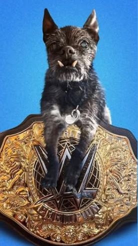 CM Punk’s dog Larry posing with Punk’s newly won world title.