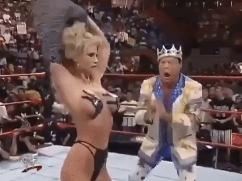 When the segment began, first out was Marc Mero and Jacqueline who was wearing Mero’s satin robe to hide her assets. Sable was next to be introduced and she walked to the ring in a ‘Sable Bomb’ t shirt. When the contest started, Jacqueline took off her robe to show off a very revealing red slingshot type of attire. There was a rather loud roar from the crowd, with Jacqueline’s skimpy outfit. She began dancing and gyrating and while playing with the straps of her bikini, her nipple was exposed on TV. Prichard said that the incident freaked McMahon out and was screaming in anger at the cameraman to pan away from her. Years later, Jackie insisted that the ‘nip slip’ was purely accidental. She had simply gotten carried away in the moment and the exposure happened. She said that she wanted to avoid that exact thing from happening, so she had her breasts taped to the bikini, but during her dance, the tape had given way. While this was live TV, the replay of the show edited out the exposure.