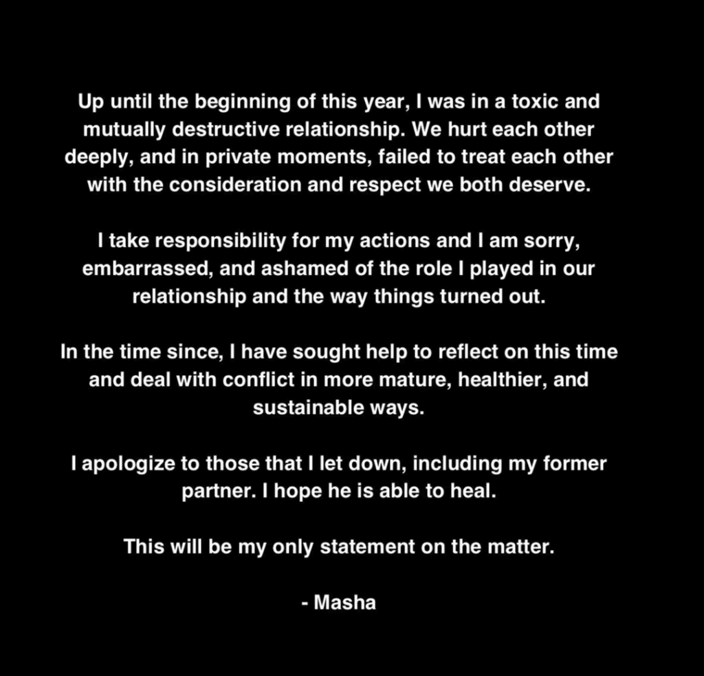 After the texts and photos were leaked, Masha was suspended from TNA upon the company doing an internal investigation. The official statement from TNA was “We take any allegations like this very seriously, and have begun an internal investigation.” Mash also was dropped from a few independent bookings because of the situation. Masha would release her own statement on the allegations…