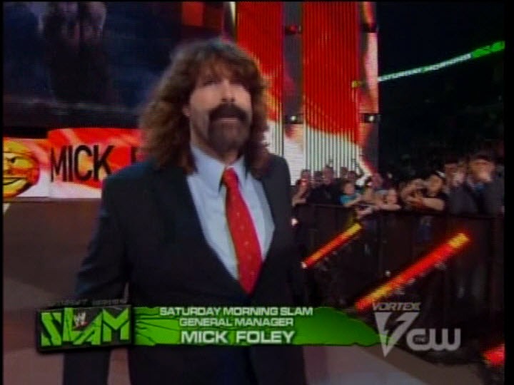 There were no real bitter rivalries or storylines carried over from Raw and Smackdown. The former King of the Death match and hardcore wrestling turned lovable teddy bear…Mick Foley was named the Saturday Slam General Manager. Not much actual wrestling, as the show was only 30 minutes…but it was packed with different things like backstage comedy skits and public service announcement videos.